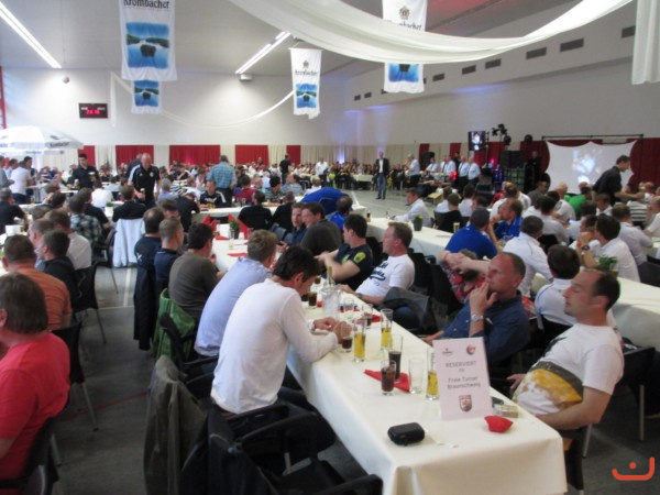 Freie Turner 1. Altherren mit den anderen Mannschaften in der Karl-Laue-Halle bei der Siegerehrung (Sieger TSV Helmstedt, Freie Turner 7. Platz) bei der 16. Krombacher Ü32.-Niedersachsenmeisterschaft am 04.Mai 2013 in Barsinghausen und die Mega-Schle.... Kuhbar.