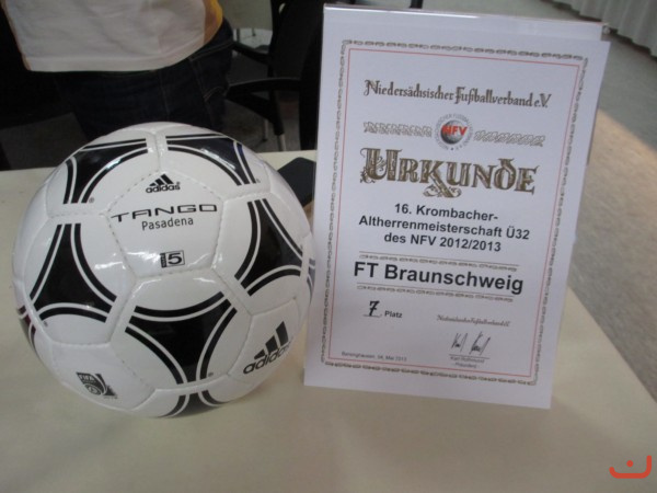 Freie Turner 1. Altherren mit den anderen Mannschaften in der Karl-Laue-Halle bei der Siegerehrung (Sieger TSV Helmstedt, Freie Turner 7. Platz) bei der 16. Krombacher Ü32.-Niedersachsenmeisterschaft am 04.Mai 2013 in Barsinghausen und die Mega-Schle.... Kuhbar.