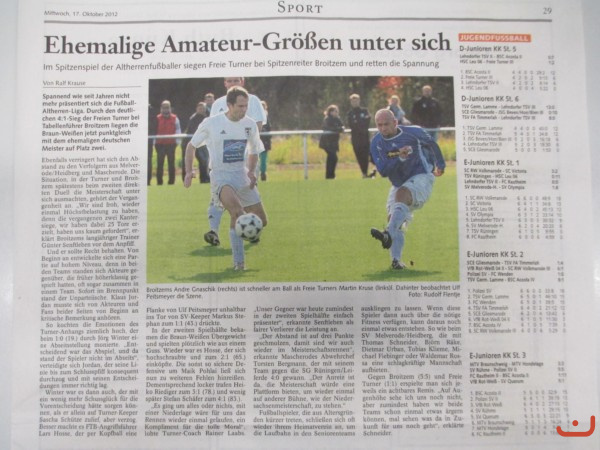 Endlich hat es mal wieder geklappt. Nach einem 1:0 Rückstand kam durch Lars Hosses Tor kurz vor der Halbzeit die Wende. Zweite Halbzeit spielte nur noch Turner und gewann verdient mit 1:4. Anschließend wurde locker in Broitzem gefeiert.